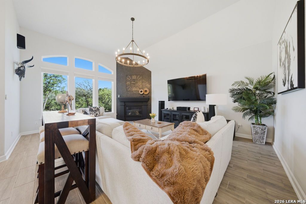 RARE GREENBELT RETREAT! Welcome to this stunning one-story retreat where everyday living feels like a private resort escape. This home offers 4 bedrooms, 2 baths, luxury upgrades and so much more! Perfectly positioned on a premium greenbelt homesite in the prestigious community of Cibolo Canyons, this exceptional residence blends refined design, thoughtful upgrades, and serene privacy with no rear neighbors. From the moment you enter, youre greeted by expansive sightlines, abundant natural light, and a seamless flow between the living, dining, and kitchen spaces-ideal for both elegant entertaining and relaxed everyday living. Floor-to-ceiling rear windows frame peaceful greenbelt views, creating a bright, airy atmosphere while maintaining a sense of seclusion. At the heart of the home, the chef-inspired kitchen is both striking and functional. An oversized island anchors the space, offering generous prep areas, abundant storage, and a natural gathering place for guests. Crisp white cabinetry extends to the ceiling, accented by illuminated glass display panels that add a sophisticated designer touch. The living area is equally inviting, centered around a modern fireplace adorned with mosaic tile-perfect for cozy evenings or hosting in style. The spacious primary suite is a true sanctuary, featuring a spa-like bath with dual vanities, an expansive walk-in shower, and an oversized walk-in closet designed for both comfort and convenience. Three secondary bedrooms provide versatility for guests, family, or work-from-home needs, with one ideally suited as a private study. Step outside to your covered patio and extended deck-an ideal setting for morning coffee or evening gatherings-overlooking a level backyard and tranquil greenbelt beyond. The community offers 2 amenity centers with pools, splash pad, fitness center, park, pavilion and nature walking trails. This is a wonderful opportunity to be in a great location near restaurants, grocery stores, and entertainment. Watch the video tour and see it today! Welcome Home